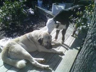 Mowgi is not a purebred Anatolian. He has 1/4 Great Pyrenees but definitely has the coat and coloring of an Anatolian. Definitely a plus with the stickers we get in our area. Mowgi had the misfortune of tangling with our Dexter bull. It was more of a playful encounter but Mowgi's leg was badly broken. Before spending the $3000 to fix him, we had his hips x-rayed (in addition to the leg). They were excellent. So we spent the $3000 and got him fixed. He has a plate in his leg that doesn't cause him any discomfort or slow him down. |